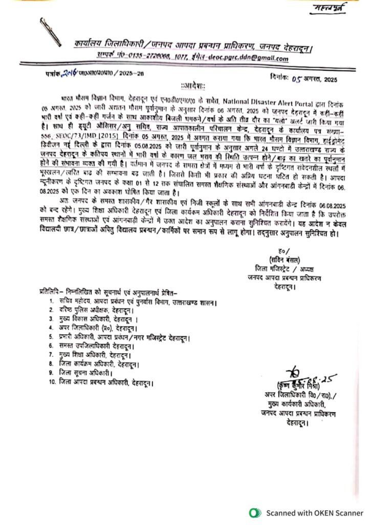 देहरादून। लगातार हो रही भारी बारिश और मौसम विभाग द्वारा जारी अलर्ट को देखते हुए, जिला प्रशासन ने बुधवार, 6 अगस्त 2025 को भी जनपद देहरादून के सभी शासकीय, अशासकीय, सहायता प्राप्त एवं निजी विद्यालयों (कक्षा 1 से 12 तक) में अवकाश घोषित कर दिया है। यह आदेश मंगलवार देर रात जिलाधिकारी सविन बंसल की […]